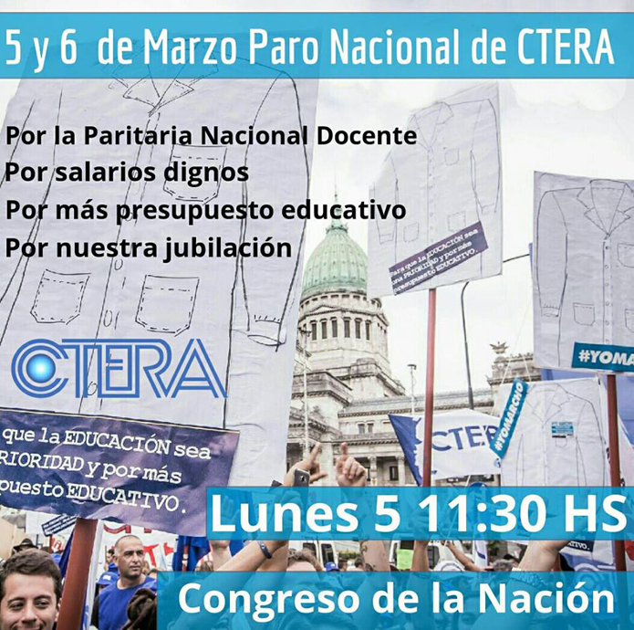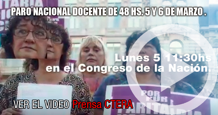 PARO NACIONAL DOCENTE DE 48 HS. 5 Y 6 DE MARZO. MOVILIZACIÓN AL MINISTERIO DE EDUCACIÓN DE LA NACIÓN. CONCENTRACIÓN LUNES 5 DE MARZO 11.30 EN CONGRESO.