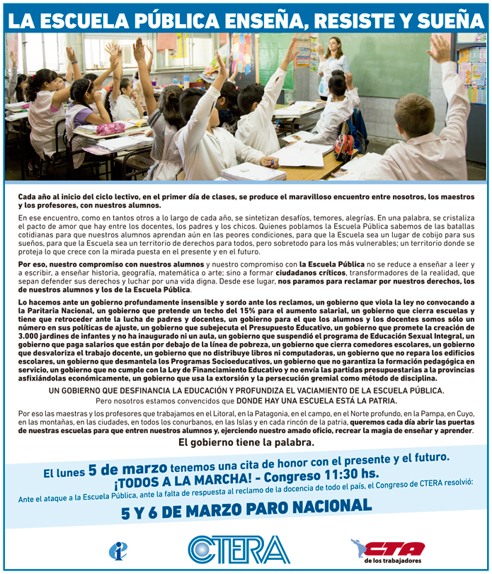 EL CONGRESO DE CTERA VOTÓ POR UNANIMIDAD CONVOCAR A UN PARO NACIONAL DOCENTE DE 48 HS. LOS DÍAS 5 Y 6 DE MARZO.
