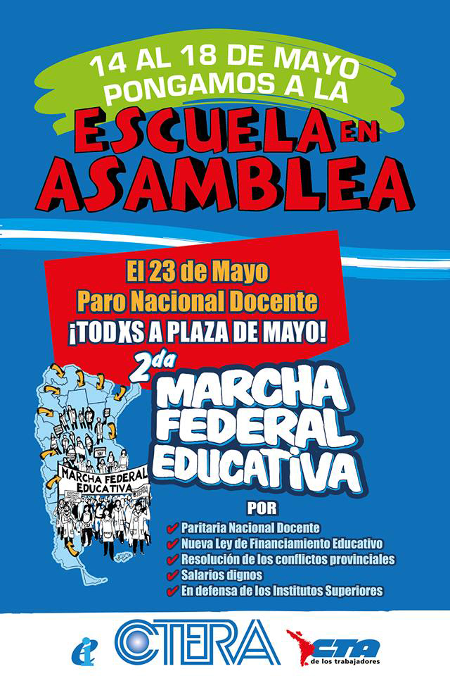 MARCHA, CONCENTRACIÓN Y PARO. LA CTERA ANUNCIÓ LA MARCHA FEDERAL DOCENTE CON ACTO Y PARO NACIONAL PARA EL 23 DE MAYO.