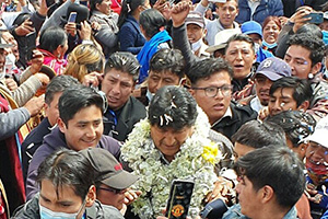 MAREA AZUL, CÁNTICOS Y WIPHALAS RECIBEN A EVO EN LA PAZ A UN AÑO DEL GOLPE
