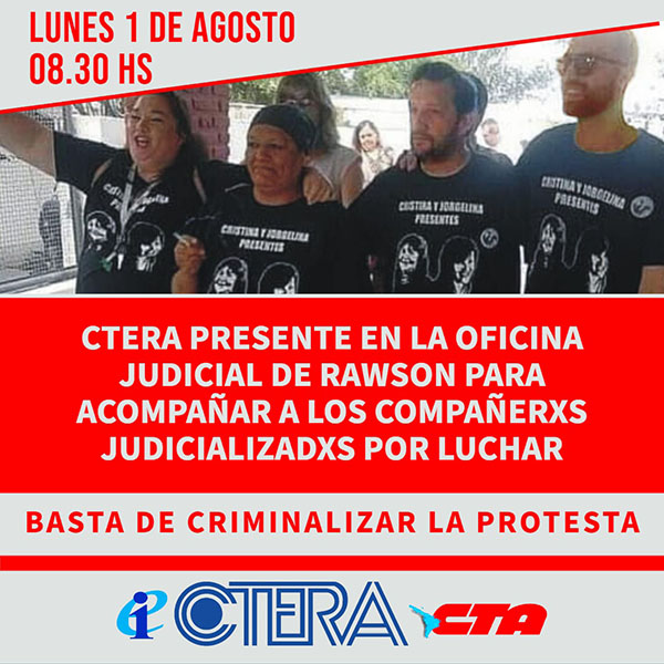 CTERA PRESENTE EN LA PRIMERA AUDIENCIA EN RAWSON: ¡NO A LA CRIMINALIZACIÓN Y JUDICIALIZACIÓN DE LA PROTESTA SOCIAL!