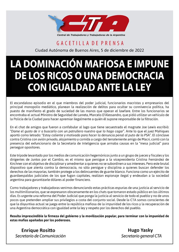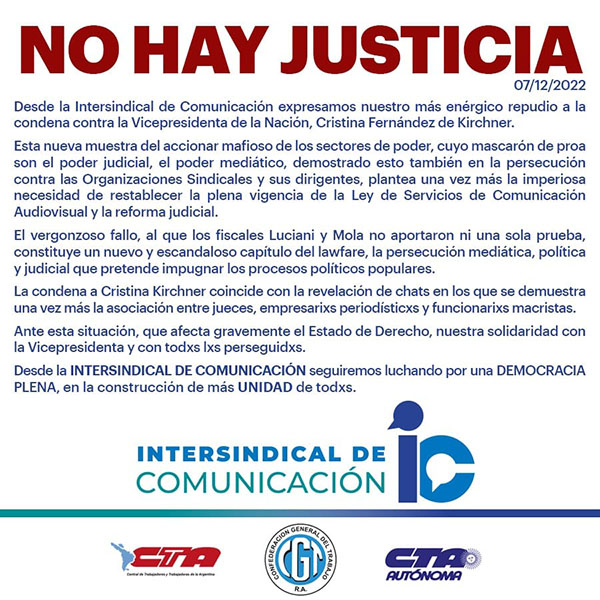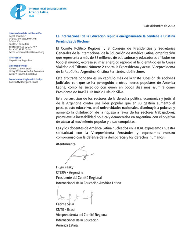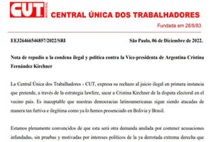 CARTA DE REPUDIO AL PROCESO DE LAWFARE CONTRA CRISTINA KIRCHNER DE LA CUT-BRASIL